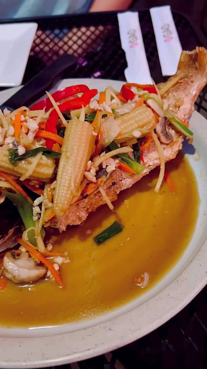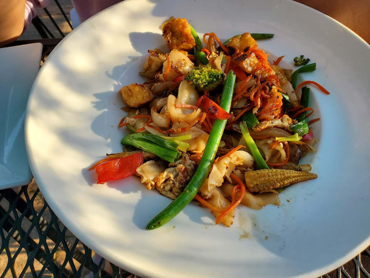 We were visiting the area and didn’t want to eat at a chain restaurant. Very happy with this quaint Thai restaurant with lovely outdoor seating. The menu gives you just enough to order a good amount of food. The dishes were very tasty and authentic. They have an onsite parking lot that makes it much easier to access the outdoor eating area. The noodle dishes were delicious and so was the calamari but the real dish of the night was the whole snapper with ginger sauce and shrimp. It’s great. We finished with dessert and ordered mango sticky rice which was excellent. Highly recommend it here ⭐⭐⭐⭐⭐